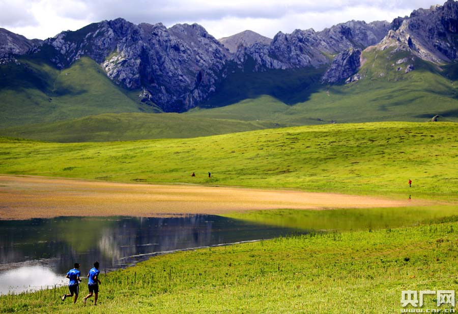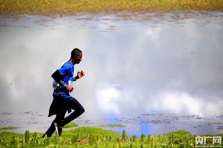 外國(guó)選手跑過(guò)美麗的草甸湖泊(央廣網(wǎng)記者 張雷 攝)