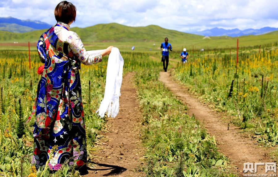 熱情的觀眾手捧潔白的哈達(dá)在賽道旁為選手加油(央廣網(wǎng)記者 張雷 攝)