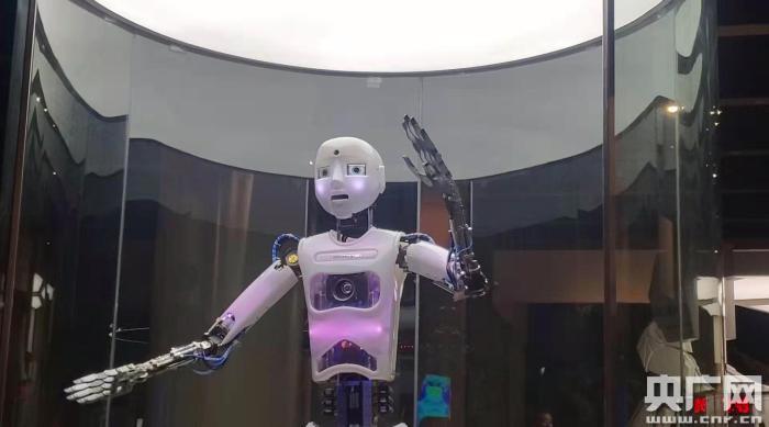 人形機(jī)器人小羅正在演唱歌曲《我和我的祖國》,眼神、手勢、身姿都惟妙惟肖。(央廣網(wǎng)記者 劉陽 攝)