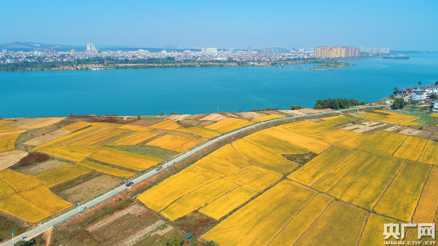 10月20日,在江西省吉安市泰和縣,空中俯瞰贛江,碧水藍天,稻田泛黃,金色岸線美如畫,構成一幅美不勝收的生態(tài)江景圖。