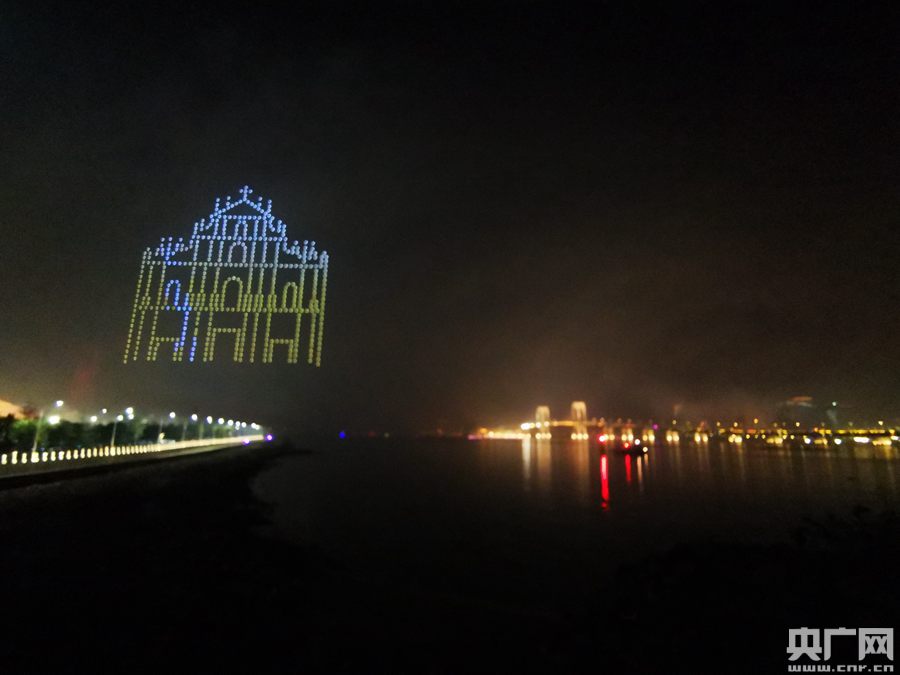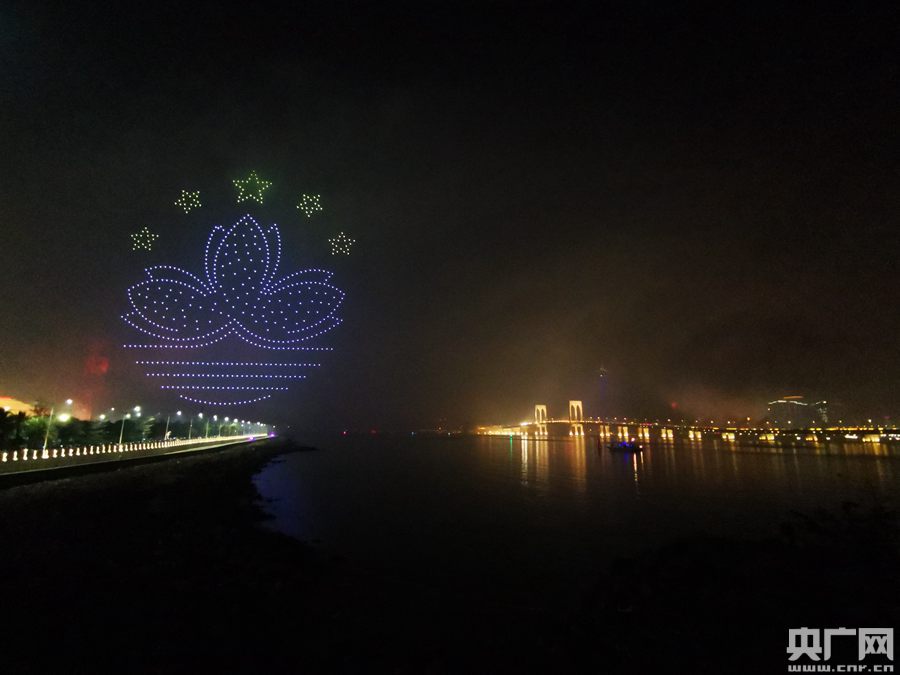 在第二篇章“歲月如歌、相約澳門”,不同造型的禮花交錯組合成各種美麗圖案,時而如綠色的樹葉漫天飛舞,時而如潔白的和平鴿自由飛翔,無人機組成的“蓮花”從水面緩緩升起,逐漸變化成為“大三巴”圖案;伴著歌曲《蓮成一家》,宏偉壯闊的“港珠澳大橋”造型飛架長空……美輪美奐的光影藝術(shù),巧妙融入珠澳兩座城市的文化元素與城市地標(biāo)。歷史記錄著澳門回歸祖國20年來的輝煌成就,歲月鐫刻著澳珠攜手深入合作的堅定步伐,“一國兩制”是騰飛的翅膀,引領(lǐng)這片熱土在世界舞臺上綻放。