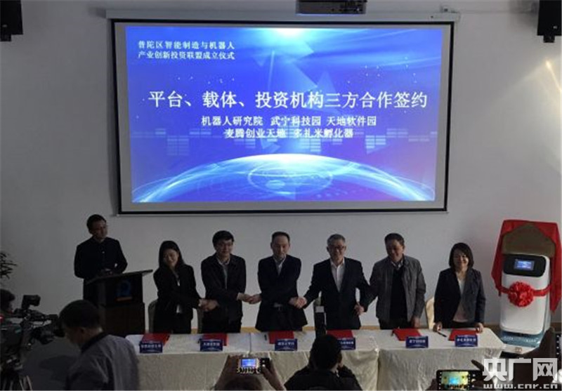 儀式上,普陀區(qū)科委黨組書記、主任李文波和普陀區(qū)智能制造與機器人產(chǎn)業(yè)創(chuàng)新投資聯(lián)盟理事長、上海普陀科技投資有限公司總經(jīng)理陳很榮共同為普陀區(qū)智能制造與機器人產(chǎn)業(yè)創(chuàng)新投資聯(lián)盟揭牌。上海機器人產(chǎn)業(yè)技術(shù)研究院院長鄭軍奇介紹了上海機器人研發(fā)與轉(zhuǎn)化功能型平臺建設(shè)情況,并與投資聯(lián)盟、天地軟件園等合作機構(gòu)代表簽約。