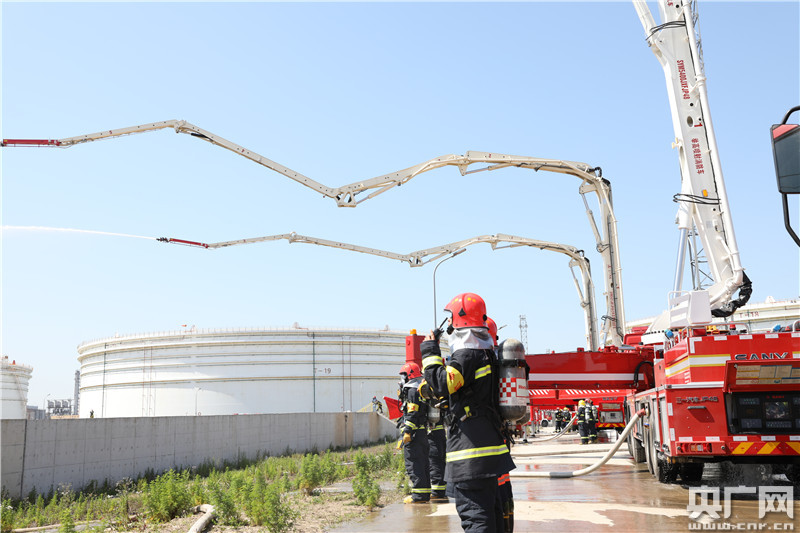 演練假設(shè)中國石化上海股份有限公司原油儲(chǔ)備罐區(qū),一座10萬立方米原油儲(chǔ)罐因雷擊導(dǎo)致密封圈起火,火勢(shì)不斷蔓延擴(kuò)大,危及臨近儲(chǔ)罐安全。災(zāi)情發(fā)生后,上海市消防救援總隊(duì)迅速啟動(dòng)應(yīng)急預(yù)案,調(diào)集1支企業(yè)專職隊(duì)、2支重型化工編隊(duì)、1支輕型化工編隊(duì)、應(yīng)急通信保障編隊(duì)、戰(zhàn)勤保障編隊(duì),共計(jì)60余輛消防車、300余名指戰(zhàn)員以及舉高噴射車、遠(yuǎn)距離供水車組、遠(yuǎn)距離供泡沫液車組、大流量移動(dòng)消防炮、滅火機(jī)器人等攻堅(jiān)裝備到場(chǎng)處置。公安、環(huán)保、衛(wèi)健委等相關(guān)社會(huì)聯(lián)動(dòng)力量到場(chǎng)協(xié)同處置。