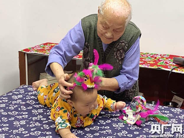 姚老給村里的孩子戴上“老虎帽”,祝愿小孩健康成長(zhǎng)的寓意(央廣網(wǎng)發(fā) 徐家輝 攝)