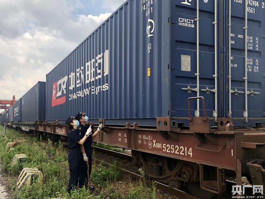 廣州海關(guān)所屬?gòu)V州車(chē)站海關(guān)關(guān)員對(duì)發(fā)運(yùn)前的班列集裝箱標(biāo)識(shí)號(hào)進(jìn)行核查 (央廣網(wǎng)發(fā) 海關(guān)供圖)