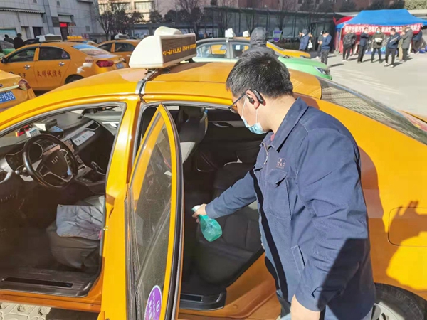 駕駛員對(duì)出租車(chē)進(jìn)行全面消毒(央廣網(wǎng)發(fā) 徐楊 供圖)