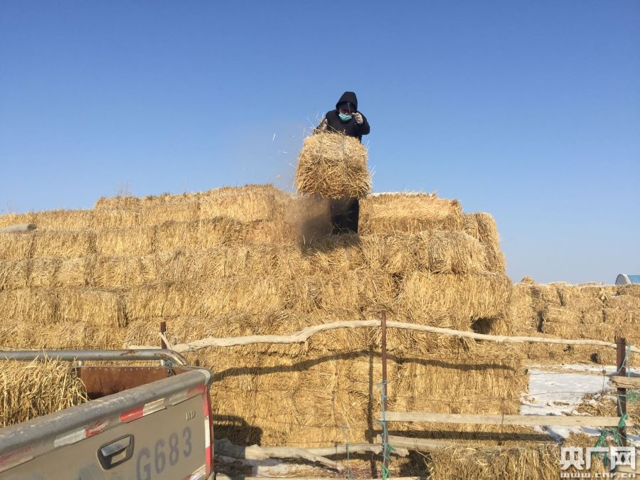 管護(hù)人員正在往車(chē)上裝飼草(央廣網(wǎng)發(fā) 通訊員王新君 攝)