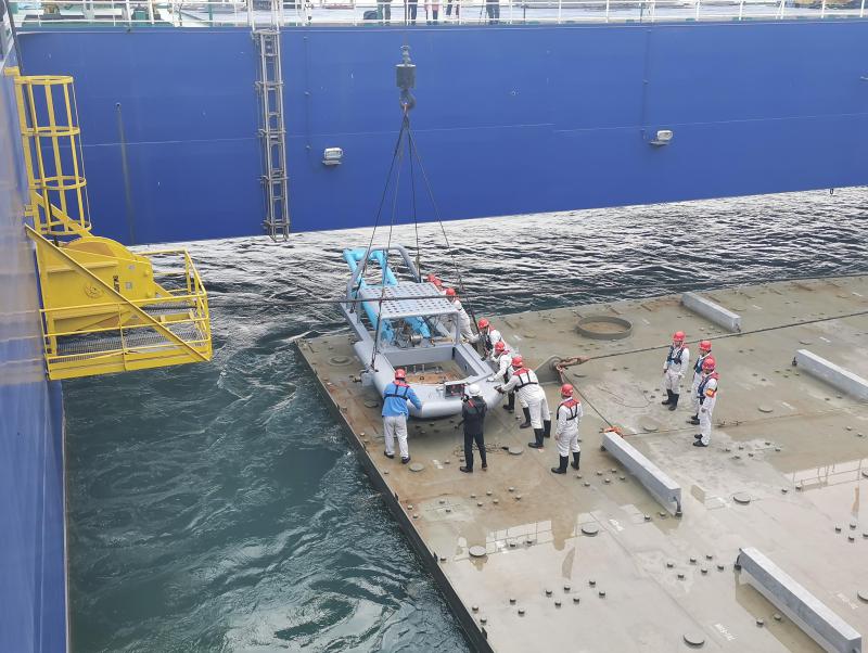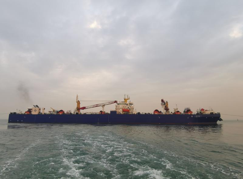 世界首制沉管浮運安裝一體船提帶E7管節(jié)前往沉放隧址 通訊員供圖