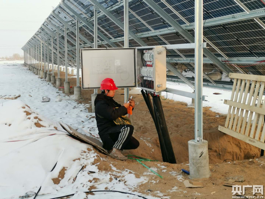 電力員工張曉磊冒著嚴寒檢查光伏發(fā)電板運行狀況(央廣網記者 張孝成 攝)