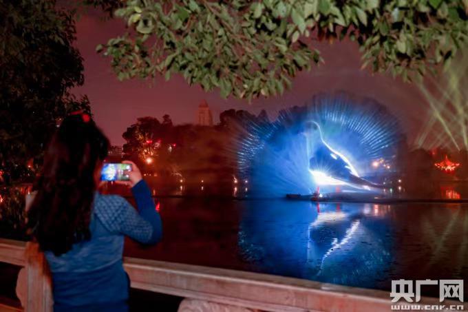央廣網(wǎng)昆明2月2日(記者陳鴻燕)近日,入夜后的翠湖公園洋溢著濃濃的新春氣息,翠湖東門水域變幻多姿的水霧投影引得游人駐足、通紅的燈籠把翠湖阮堤映射得格外亮眼,吸引著不少市民駐足拍照打卡,成為春城昆明又一個(gè)新春夜景。據(jù)了解,此次夜景打造是第十四屆昆明海鷗文化節(jié)的活動(dòng)內(nèi)容之一。