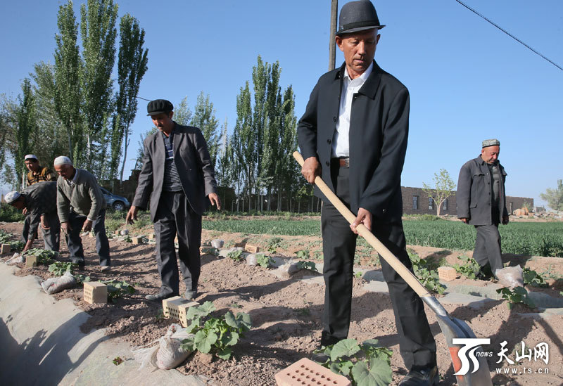 則克爾認(rèn)真看了種子的發(fā)育情況后,帶著一些農(nóng)民又沿著田埂除草、翻土。6月就要瓜熟蒂落了,則克爾期待著豐收的日子。他說(shuō):“到時(shí)候我會(huì)連穿鞋子的時(shí)間都沒有呢!