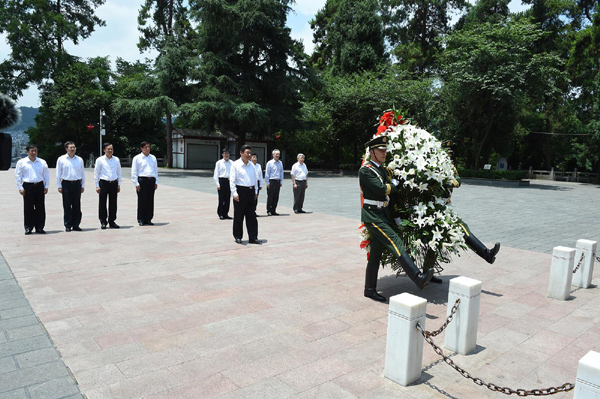新華網北京6月16日電 據新華社客戶端報道,藍天白云,青松翠柏。習近平總書記16日離京來到貴州遵義考察,一下飛機就直奔紅軍山烈士陵園,向紅軍烈士紀念碑敬獻花籃。紀念碑四周的浮雕展現(xiàn)了當年紅軍浴血奮戰(zhàn)的場景。在“突破烏江天險”浮雕前,總書記駐足感嘆:“當時要是過不去就危險了……”碑上“紅軍烈士永垂不朽”8個字是鄧小平同志題寫的,他佇立凝望,聽取介紹。這是黨的十八大后習近平總書記第一次來黔考察。