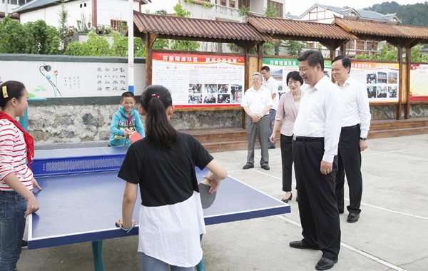 總書記來到貴州遵義的花茂村,在該村白泥組的黨員群眾之家門口,幾個孩子在打乒乓球,總書記走上前去觀看。得知孩子們是放學了在這里玩,他問大家學校遠不遠、放學怎么回家。孩子們說,只有一公里的路,走10多分鐘就到家了,總書記聽了微笑著點點頭。