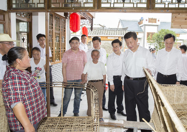 路旁田里,連片的向日葵花開得正艷,習近平下車駐足欣賞。當?shù)馗刹扛嬖V總書記,伴隨美麗鄉(xiāng)村建設,山花繁茂的花茂村成了婚紗拍照地,不少附近的市民結婚都到這來。沿著土墻和木欄相伴的鄉(xiāng)村小徑,習近平邊走邊詢問當?shù)孛撠氈赂磺闆r?吹锦r花盛開,道路兩旁的房子干凈整潔,他有感而發(fā)地說:“怪不得大家都來,在這里找到鄉(xiāng)愁了。”聽說水電路都解決了,他又關切地詢問衛(wèi)生情況?吹綆孜淮迕裾诼愤叿孔永锞幪僖,他走進去問:“編一個多長時間?”聽說一個三人座藤椅只要編4天,能賣1200塊錢,他說:“如果銷路好,那收入還挺高!