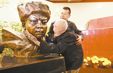 ↑李繼德老人參觀黃繼光紀(jì)念館,撫摸著黃繼光雕像激動不已。特約記者孫紹建 攝