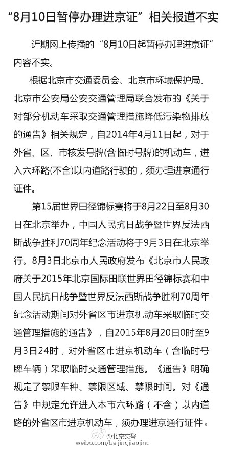 原標(biāo)題:北京市交管局:8月10日暫停辦理進(jìn)京證報(bào)道不實(shí)
