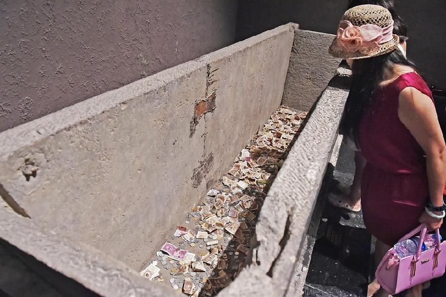 游客在參觀河南省洛陽(yáng)博物館石刻館內(nèi)的距今1500年北魏時(shí)期印有升仙圖案的石棺材,前來(lái)參觀游客,看到這口千年棺材表面為升仙圖案,紛紛相傳能為自己帶來(lái)財(cái)運(yùn)和健康平安,于是不少游客以圖“吉利”爭(zhēng)相向石棺內(nèi)丟錢。