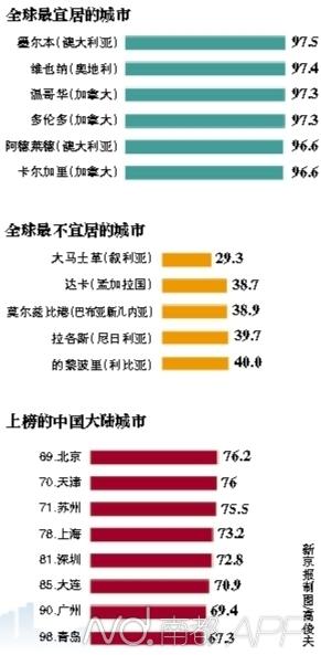 中國大陸共有8個城市上榜。除了北京蟬聯(lián)中國大陸最宜居城市外,天津及蘇州緊隨其后,分列第70位和第71位。而上海、深圳、廣州等一線城市也都榜上有名。