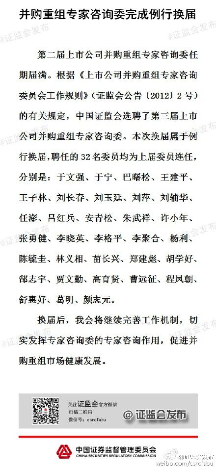 證監(jiān)會(huì):并購重組專家咨詢委完成例行換屆