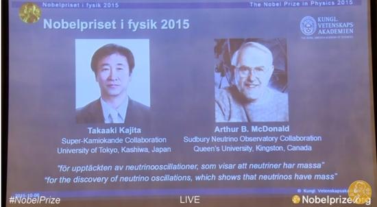 【環(huán)球網(wǎng)綜合報道】據(jù)諾貝爾獎官網(wǎng)的最新消息,瑞典斯德哥爾摩當(dāng)?shù)貢r間6日中午11時45分,2015年諾貝爾物理獎在當(dāng)?shù)氐娜鸬浠始铱茖W(xué)學(xué)院揭曉,梶田隆章(Takaaki Kajita)和 阿瑟-麥克唐納(Arthur B. McDonald)榮獲該獎項。因二人發(fā)現(xiàn)中微子振蕩,這表明中微子有質(zhì)量。
