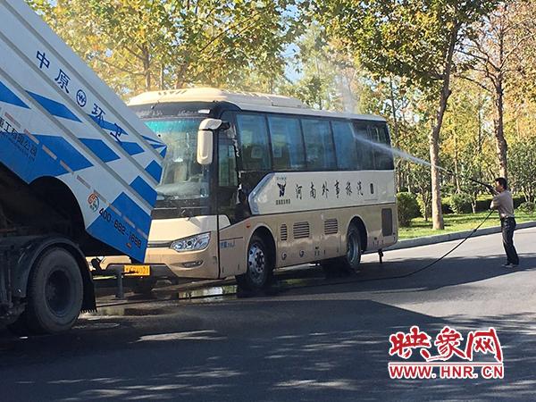 這輛車車牌號(hào)為豫AE0073的灑水車,車身上印有“中原環(huán)衛(wèi)”字樣。灑水車的尾部接出一根水管,一名男子拿著水槍向一輛大巴車噴水。旁邊還站著一名男子一邊抽著煙,一邊與洗車男子有說(shuō)有笑。大巴車的車牌號(hào)為豫AP6021,車身上寫著“河南外事旅游”。