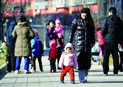 ▲天氣好但氣溫低,上午在通州某小區(qū)市民外出穿著厚厚的冬衣攝/記者劉暢
