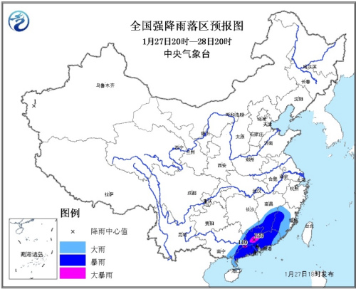 受南支槽和偏南暖濕氣流共同影響,預計27日20時至28日20時,廣西東部、廣東、江西南部以及福建大部等地有大雨或暴雨,其中,廣東中北部的局部地區(qū)有大暴雨(100~120毫米);上述地區(qū)最大小時雨強可達20~30毫米。為此,中央氣象臺1月27日18時發(fā)布暴雨藍色預警。