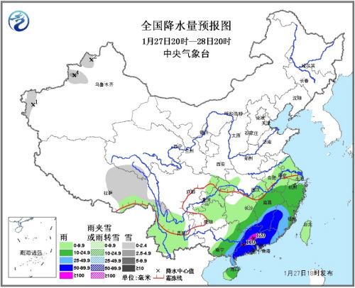 27日20時至28日20時,新疆西部、西藏東部等地的部分地區(qū)有小到中雪或雨夾雪;江南中東部、華南中東部等地有中到大雨,其中,江西南部、福建西部、廣東等地的部分地區(qū)有暴雨,局地有大暴雨(100~120毫米)。黃海南部、南海東北部和東南部、東海大部海域?qū)⒂?~7級、陣風8級風。