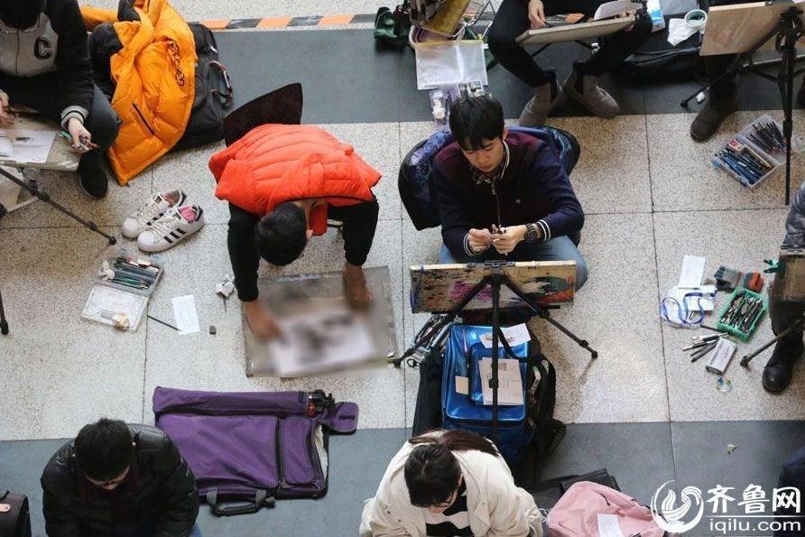 2月16日,2016年山東省藝考?颊嚼_帷幕,在濟南舜耕國際會展中心美術(shù)類專業(yè)考場,一位用腳畫畫的學生引起了記者注意。與其他考生不同的是,他的畫板沒有放在支架上,而是直接放在考場大理石地面上,今天的最高氣溫只有8度,這位考生赤著雙腳完成了考試。圖為一位考生用腳畫畫。 白少光 攝 圖片來源:齊魯網(wǎng)