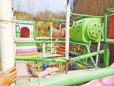 接到讀者報料后,記者當天上午就找到了蝴蝶谷體育公園。它位于鄭州尖崗水庫西側金蝶路旁,與婁河村毗鄰。記者在現(xiàn)場看到,公園門前的那條路上堆積著大量建筑垃圾,而門口修建的停車場,亦被黃土覆蓋。再往里走,內設兒童滑梯已經(jīng)塌了,板凳馬、推鐵環(huán)、旱龍舟、風火輪,趣味擂臺等場地設施,不是荒廢便是破成一堆,鐵欄桿上銹跡斑斑。