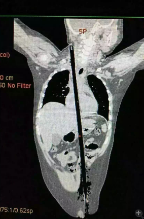 市兒童醫(yī)院組織專家團隊對孩子的病情進行檢查、評估后發(fā)現(xiàn),竹棍由患兒左側(cè)大腿根部插入,經(jīng)腹腔穿透胃、肝臟、膈肌入胸腔,并穿透患兒心臟,經(jīng)胸腔入頸部,此刻不能拔除竹棍,因為去除竹棍會導致心臟、肝臟破裂大出血導致休克,危及性命。