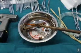 由于竹棍自心臟的右心房膈面穿入心臟,并由右房近左房頂處穿出心臟,經(jīng)右胸頂刺入右頸部,右心房破口處緊鄰右冠狀動脈,幸運的是胸腔內(nèi)大血管無損傷,在體外循環(huán)輔助下,醫(yī)護團隊異物穿出處鋸斷異物,將插入心臟內(nèi)的竹棍截斷拔除,修補心臟破損處,向上繼續(xù)尋找周圍組織的游離異物,見異物緊臨頸部大血管,經(jīng)精細手術(shù),終于抽出了異物。整個手術(shù)時間花了十多個小時。