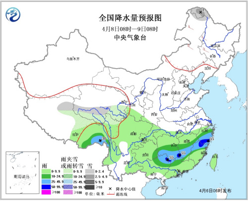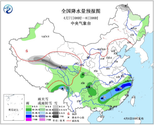 7日08時至8日08時,黑龍江西北部、吉林東南部、西藏北部、青海中南部等地有小到中雪或雨夾雪,局地有大雪;西藏東南部、云南西北部、川西高原北部、重慶西南部、貴州中北部、江南中南部、廣西東北部、廣東西北部等地的部分地區(qū)有中到大雨,其中浙江中部、江西東北部、廣西東北部等的局地有暴雨(50~70毫米)。內(nèi)蒙古中東部、東北地區(qū)西部等地有4~6級風(fēng)。南疆盆地有揚沙或浮塵。東海北部海域?qū)⒂?~8級、陣風(fēng)9級的西南風(fēng)轉(zhuǎn)4~6級、陣風(fēng)7級的西北風(fēng)。