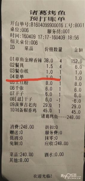 4月9日,鎮(zhèn)江市民馬先生帶著家人和朋友來到了鎮(zhèn)江城區(qū)大市口解放路新開業(yè)的一家諸葛烤魚店,吃完結(jié)賬時(shí),店家告知一共消費(fèi)了248元,于是服務(wù)員向馬先生提供了一張賬單。細(xì)心的馬先生發(fā)現(xiàn)在收費(fèi)單上,除了馬先生一家人消費(fèi)的菜品、餐具以及餐巾紙的價(jià)格以外,第四項(xiàng)赫然寫著菜單的價(jià)格收費(fèi)一元。馬先生告訴記者,因?yàn)樯碳也]有提前告知菜單需要收費(fèi),所以結(jié)賬時(shí)感到有點(diǎn)意外,而且之前也從來沒有遇到過這樣的情況。為此,馬先生向服務(wù)員提出了異議,對方表示菜單要收費(fèi)是老板定的,他們也沒有辦法?紤]到服務(wù)員是打工的,也不容易,之后也就沒多計(jì)較,菜單也并未帶走。因?yàn)橛屑胰撕团笥淹校瑸榱瞬黄茐臍夥,最終并未找老板詢問菜單要收費(fèi)的緣由。