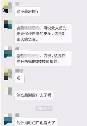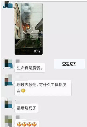 李先生(化名)描述,拍攝的時候他兩只腳都在抖,心里也很激動。在看到死者身上著火的時候他就沖下樓去,看看能不能幫上忙。樓下圍了好多人,一直都有砸門聲,他也幫不了。李先生(化名)表示,他沒有將視頻發(fā)到朋友圈,只是發(fā)到了一個同學(xué)群里,F(xiàn)在他的手機(jī)微信已經(jīng)被封號了,朋友給我截了當(dāng)時的圖。