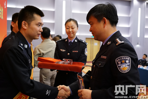 圖為北京鐵路公安局政治部主任姚勇為“十大杰出青年衛(wèi)士“頒獎。