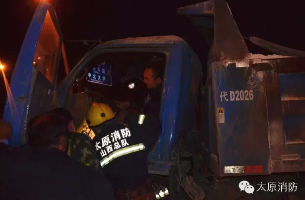 車禍的起因為一輛車逆行。事故發(fā)生后,其中一輛貨車的司機被困。 太原市公安消防支隊柴村中隊官兵迅速到達(dá)現(xiàn)場,當(dāng)時貨車司機被困駕駛室內(nèi),意識已經(jīng)開始模糊,如果不及時搶救,很可能有生命危險。指揮員立即命令警戒組兩名官兵對周圍進行現(xiàn)場警戒,救援組官兵利用液壓破拆工具及鐵鋌等對駕駛室車門、座位等部位進行破拆。