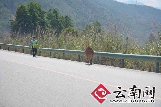 云南網(wǎng)訊(記者 楊之輝 通訊員 張鵬翔 肖珩)一頭黃牛在高速路上到處亂串,嚇得過往車輛紛紛緊急避讓,云南大保高速路交警接警后,及時將牛驅(qū)離高速路,消除了安全隱患。