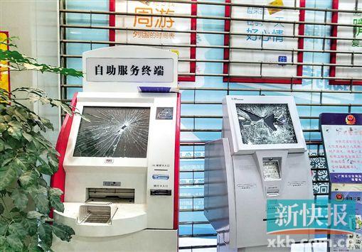 一家銀行的自助服務終端被砸壞!∨沓/攝