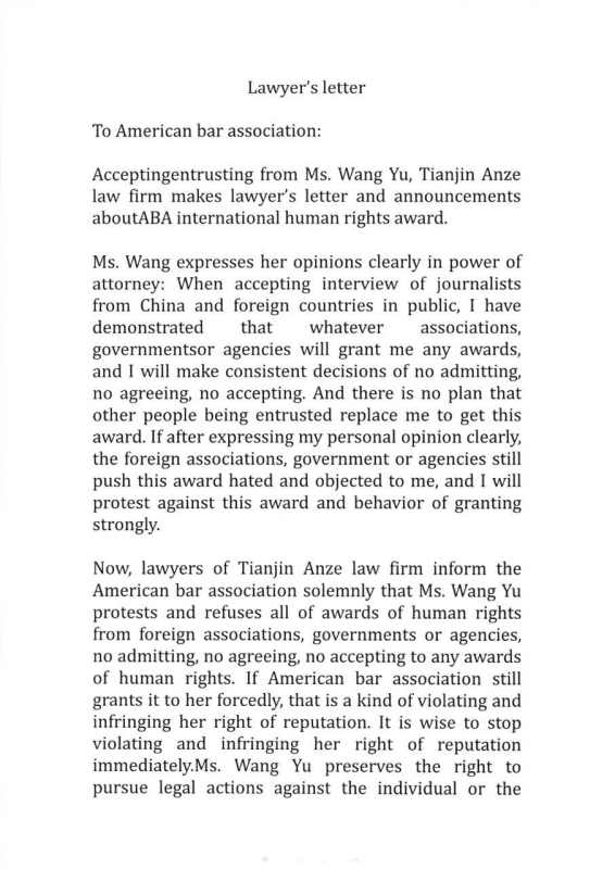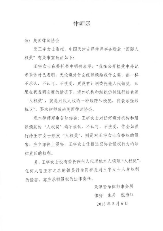 該律師函稱(chēng),“本律師鄭重告知美國(guó)律師協(xié)會(huì):王宇已多次公開(kāi)表明對(duì)境外機(jī)構(gòu)和組織頒發(fā)的‘人權(quán)獎(jiǎng)’不承認(rèn)、不認(rèn)可、不接受,如你會(huì)強(qiáng)行給王宇女士頒發(fā)‘人權(quán)獎(jiǎng)’,是對(duì)王宇女士名譽(yù)權(quán)的侵害,應(yīng)立即停止侵害,王宇女士保留追究你會(huì)侵權(quán)行為法律責(zé)任的權(quán)利!