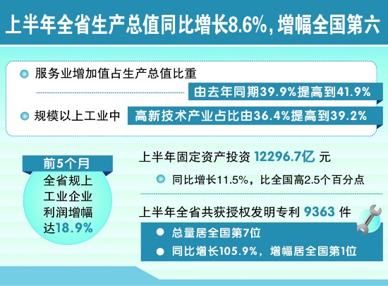 上半年,全省生產(chǎn)總值同比增幅居全國第6位,規(guī)模以上工業(yè)增加值增幅居全國第6位,社會消費品零售總額增幅居全國第4位;前5個月,規(guī)模以上工業(yè)企業(yè)利潤增幅居全國第5位……