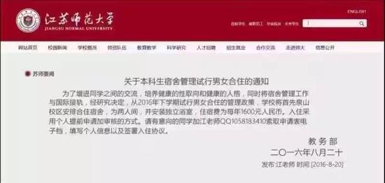 這條《關(guān)于本科生宿舍管理試行男女合住的通知》稱,從2016年下學(xué)期試行男女合住的管理政策,學(xué)校將首先泉山校區(qū)安排合住宿舍,為兩人間,并安裝獨立浴室,住宿費為每年1600元。