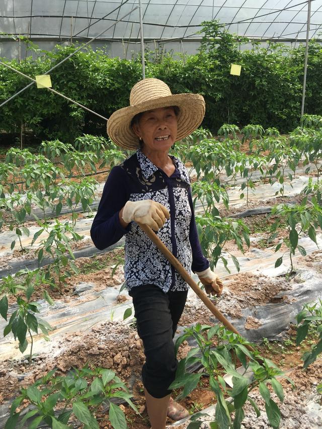 正在大棚里為辣椒地除草的村民李考鳳