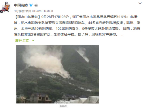 央廣網(wǎng)北京9月28日消息 據(jù)公安部消防局官方微博消息,9月28日17時(shí)28分,浙江省麗水市遂昌縣北界鎮(zhèn)蘇村發(fā)生山體滑坡,目前,消防官兵搜救出2名被困群眾,生命體征平穩(wěn)。據(jù)了解,現(xiàn)場共37戶房屋。同時(shí),村莊旁邊小溪形成堰塞湖,可能發(fā)生局部二次滑坡。