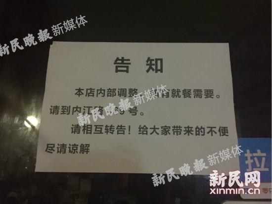 據(jù)爆料,事發(fā)地點(diǎn)是位于雙陽(yáng)支路127號(hào)的一家名為“錢(qián)家喬老爺銅爐涮鍋”的火鍋店。19日晚,新民晚報(bào)新民網(wǎng)記者來(lái)到這里,發(fā)現(xiàn)火鍋店大門(mén)緊鎖,門(mén)上告示稱:“本店內(nèi)部調(diào)整,如有需要就餐請(qǐng)到另一家門(mén)店就餐。”