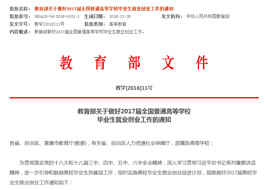 《教育部關(guān)于做好2017屆全國(guó)普通高等學(xué)校畢業(yè)生就業(yè)創(chuàng)業(yè)工作的通知》就此提出如下要求: