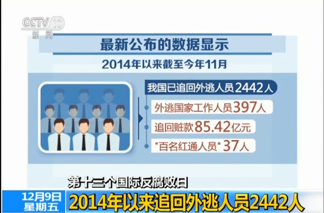中央反腐敗協(xié)調小組國際追逃追贓工作辦公室最新公布的數(shù)據(jù)顯示,2014年以來,截至今年11月,我國已追回外逃人員2442人,其中外逃國家工作人員397人,追回贓款85.42億元,“百名紅通人員“37人。