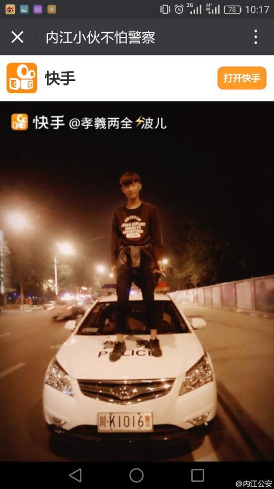 “內(nèi)江公安”所發(fā)微博5張配圖也顯示,不同的小伙分別在內(nèi)江不同位置站在3輛警車的引擎蓋上,其中一名小伙還用腳踢警車。