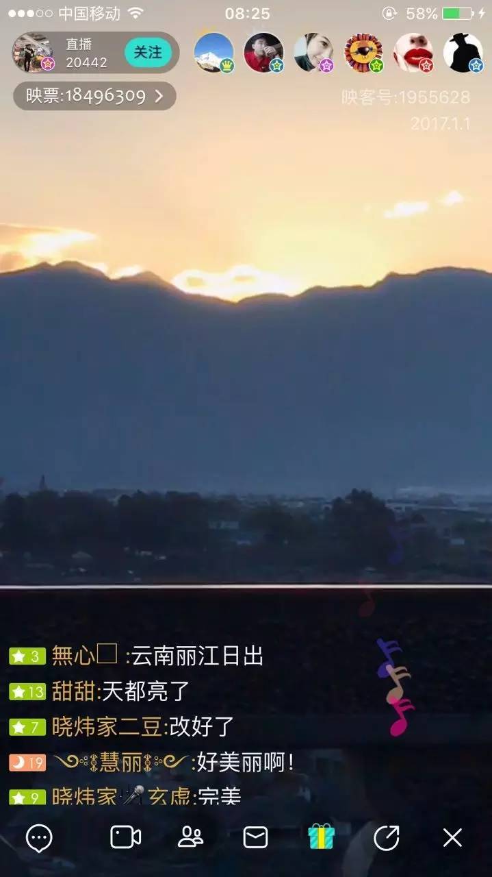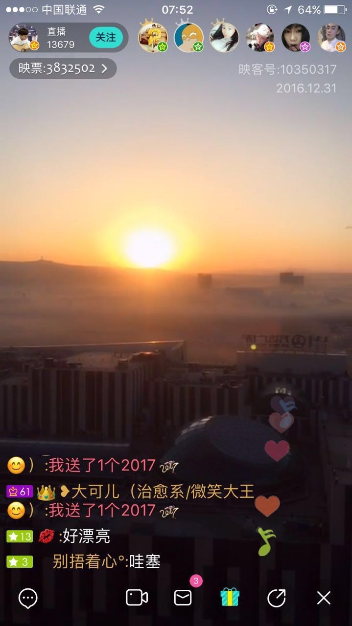 從早上6點(diǎn),來自祖國(guó)寶島臺(tái)灣的映客主播就開啟了直播,隨著太陽(yáng)的升起,每一個(gè)被陽(yáng)光點(diǎn)亮的城市都有主播開啟直播。福建、上海、浙江、香港……9點(diǎn)40分,在離海最遠(yuǎn)的城市新疆塔城,來自人民大學(xué)的支教老師們開啟了直播。至此,網(wǎng)友通過直播鏡頭見證了2017年1月1日的太陽(yáng)升起在祖國(guó)每一個(gè)角落。