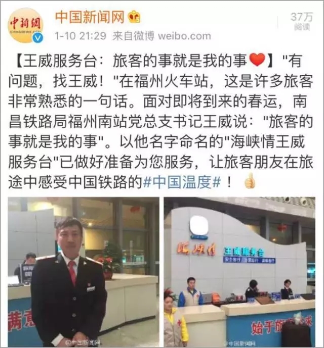 王威是南昌鐵路局福州南站黨總支書記,從事鐵路一線客運工作28年來,以服務為宗旨、待旅客如親人,以他名字命名的“海峽情 王威服務臺”成為一張亮麗的名片。